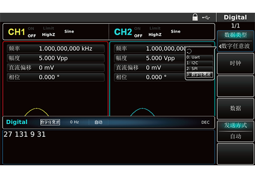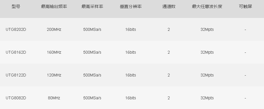 UTG8000D系列集函數(shù)發(fā)生器、任意波形發(fā)生器、脈沖發(fā)生器、諧波發(fā)生器、模擬/數(shù)字調(diào)制器、頻率計等功能于一體的多功能混合信號發(fā)生器;1μHz頻率分辨率、以及1mV的幅度分辨率,可生成精確、穩(wěn)定、純凈、低失真的輸出信號,還能提供高頻率且具有上升沿和下降沿1ns分辨數(shù)字合成的脈沖波。獨立等性能雙通道設計,最高實時采樣率高達500MS/s,最大任意波長度高達32Mpts,同時具備7GB非易失波形存儲;國內(nèi)首款選配數(shù)字信號發(fā)生器輸出模塊;超寬8英寸LCD高清屏顯示,人性化的界面設計及合理的功能鍵盤布局,給用戶帶來更為人性化的使用體驗。