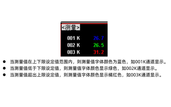 特設(shè)溫度上下限超限報(bào)警,和超限讀數(shù)顏色變化警示,可對(duì)每一路溫度數(shù)據(jù)進(jìn)行上限和下限設(shè)置