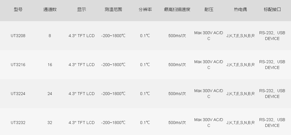 UT3200系列多路溫度測試儀包含4款型號(hào)分別為UT3208, UT3216, UT3224和UT3232, 其區(qū)別在于四款型號(hào)分別對(duì)應(yīng)8、16、24和32路熱電偶測試通道數(shù)。