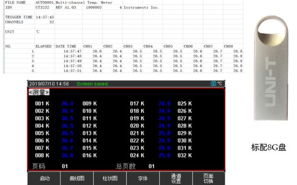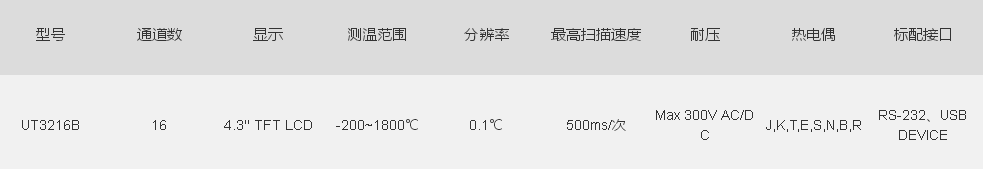 UT3200B系列多路溫度測試儀,包含1款型號UT3216,對應16路熱電偶測試通道數。
