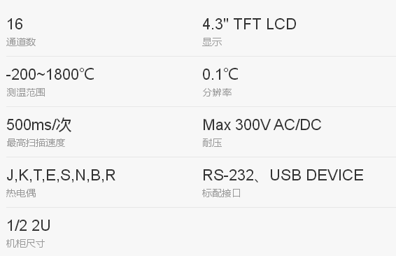 本系列產品采用4.3英寸液晶顯示屏,儀器支持-200℃~1800℃的測試范圍,支持J,K,T,E,S,N,B,R型熱電偶輸入。可同時對多路溫度數據進行采集,具有直觀數值讀數,柱形圖和曲線圖形顯示方式, 使用者可以多方式讀取各參數, 也可以把數據記錄在USB存儲器上,同時儀器也具有上超下超報警和通訊傳輸。其完善的功能、優越的性能和操作簡單的特點,能大量滿足生產、實驗室和研發測量的需求。儀器支持USB實時存儲采樣數據,用戶可以對每路數據進行獨立校正。同時標配RS232和USB通訊接口,通過標配的計算機軟件可實現數據采集,分析和打印