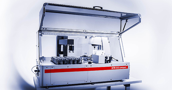 緊湊型 HTR 系列在輕型臺式儀器設計中借助安東帕 MCR 102 或 MCR 302 流變儀,為流變測量提供自動化樣品處理和調整功能。緊湊型 HTR 是初級流變測量自動化的理想之選,它可使用雙托盤提供高處理量操作:36 個樣品,每個托盤 18 個測量杯。操作期間可通過樣品抽屜添加樣品瓶,而流變儀和樣品制備階段可并行運行。