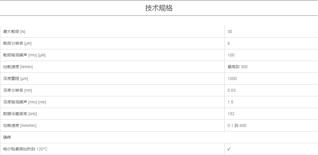 該儀器載荷范圍大,能夠確定多種樣品的附著力、耐劃擦性、硬度、彈性模量、摩擦和磨損等。它適用于有機和無機涂層以及軟硬涂層(1 μm 到 20 μm 之間),也適用于塊體材料。