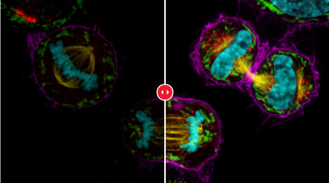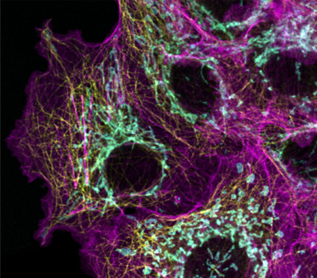 COS7有絲分裂細胞。染色質(藍綠色,mCherry)有絲分裂紡錘體(黃色,EGFP),高爾基體(紅色,Atto647N),線粒體(綠色,AF532)肌動蛋白絲(品紅色SiR700)。 樣本提供方:蘇黎世大學的Jana Dohner和Urs Ziegler;表達mCherry的細胞由Daniel Gehrlich贈送。SiR由Spirochrome贈送