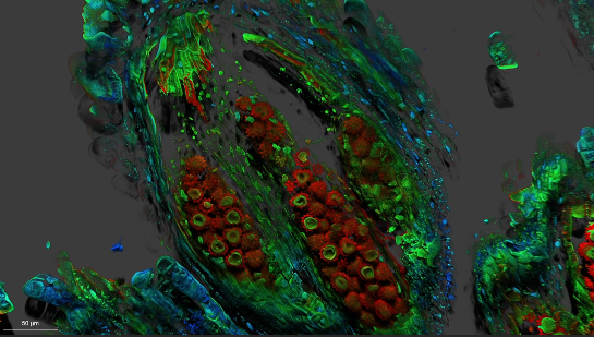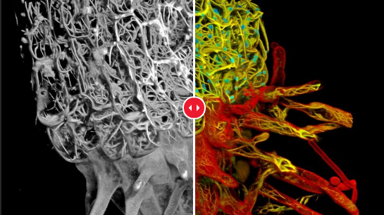 斑馬魚胚胎。 綠色: 血管,EGFP/品紅色: 細胞核,Hoechst。 使用TauContrast識別血管標記;來源于壽命的信息將血管信號與內源性信號區分開來。 樣本提供方: 法國斯特拉斯堡的IGBMC的Julien Vermot。
