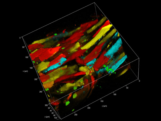 彩色顯示的小鼠小腸,使用熒光標(biāo)記并通過多色示蹤劑追蹤譜系。譜系示蹤干細胞以青色(CFP)、綠色(GFP)、黃色(YFP)和紅色(RFP)顯示。 圖像大小約為700x700x150立方微米。使用STELLARIS 8 DIVE進行雙光子激發(fā)成像。 樣本由荷蘭癌癥研究所(荷蘭阿姆斯特丹)J. van Rheenen提供。