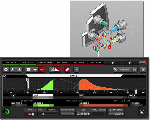 上圖: 4Tune非退掃描探測系統(tǒng): 1) 可變二向色鏡 (VD)。 2) 可變帶通(VB)。 3)Power HyD NDD 或 PMT。 下圖: 直觀的4Tune用戶界面,可輕松設(shè)置380至800納米的所有顏色的探測窗口。