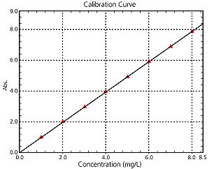 高錳酸鉀溶液濃度和吸光度的線性曲線。直到8Abs都有好的線性。