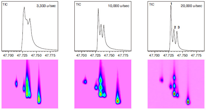 GCxGC要求具有超快的掃描速度高速采樣功能。GCMS-QP2010 Ultra高達20,000 u/sec的高速性能提高了色譜峰的分離能力。