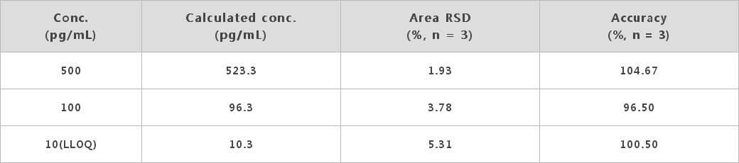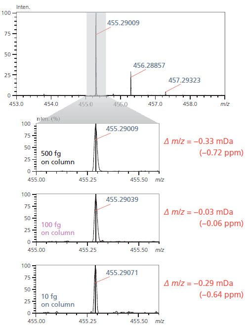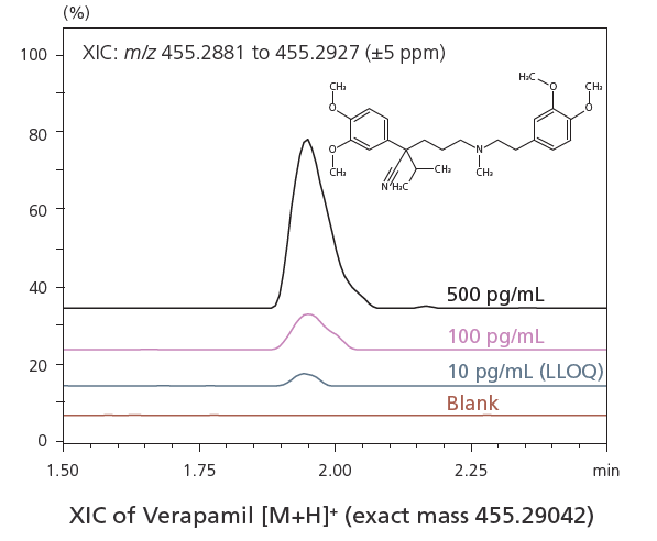 LCMS-9030的高靈敏度以及由寬濃度范圍內(nèi)的質(zhì)量測定準確度帶來的高選擇性,為定量分析開辟了新的基礎。真實的離子計數(shù)確保整個色譜峰洗脫過程中的所有測量結果都在很窄的提取離子色譜(XIC)窗口內(nèi)。如下圖所示,在維拉帕米(Verapamil)的定量分析中,即使在10 fg上樣量時,質(zhì)量測定誤差也小于1ppm,并且所有數(shù)據(jù)點都在5 ppm的XIC窗口內(nèi)。從而實現(xiàn)了準確、可重復和高選擇性的定量分析。此外,LCMS-9030質(zhì)量測定準確度的穩(wěn)定性使得相同的XIC設置可以輕松地用于一系列不同批次的樣品分析。