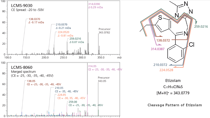 為了使數(shù)據(jù)依賴采集模式(DDA)設置變得容易,LCMS-9030采用了自動碰撞能量(CE)分布功能,以實現(xiàn)有效的碎片化。自動碰撞能量分布功能可以使用戶即使在碰撞能量未知的情況下也能獲得高質(zhì)量的MS/MS圖譜。在下面的示例中,將用自動CE分布功能獲得的QTOF圖譜與在LCMS-8060上獲得的一系列不同碰撞能量的合并譜進行了比較。實驗結果證明兩者具有很好的一致性,這也證明了LCMS-9030在DDA模式下可以獲得高質(zhì)量的質(zhì)譜圖。