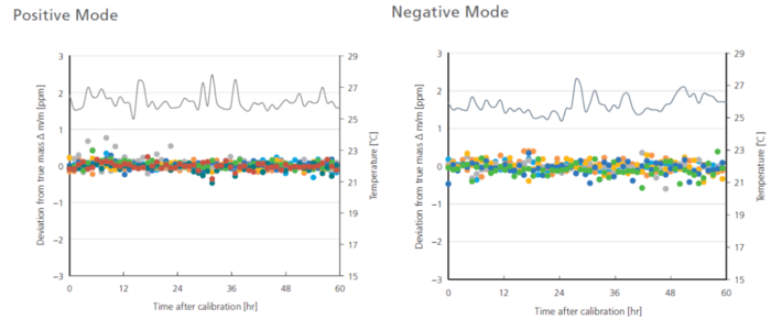 對于高分辨準確質(zhì)量質(zhì)譜(HRAM)而言,質(zhì)量測定準確度是至關重要的性能,也是所有應用的基礎。LCMS-9030的質(zhì)量測定準確度可以為未知物鑒定提供可靠的高置信度,并且保持長久的穩(wěn)定性。