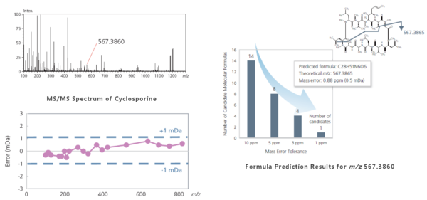 MS/MS質(zhì)譜圖是未知化合物結構解析的關鍵工具,而數(shù)據(jù)解析的方便性直接取決于MS/MS模式采集下的質(zhì)量測定準確度。得益于能產(chǎn)生高豐度碎片離子的碰撞池技術,LCMS-9030在MS/MS模式下具有與MS模式一樣的高質(zhì)量測定準確度,這對于結構分析是很理想的。環(huán)孢菌素(Cyclosporine)的MS/MS結構分析結果如下圖所示,可以看出,與假定結構碎片匹配的離子質(zhì)量誤差都小于1 mDa。另外,在設定不同允許誤差時對m/z 567.3860進行分子式預測的結果數(shù)目也進一步表明,MS/MS的質(zhì)量測定準確度對結果正確性的影響是直接的。