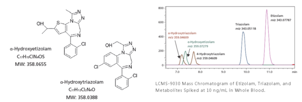 LCMS-9030的高分辨準確質(zhì)量數(shù)據(jù)可以區(qū)分具有相同名義質(zhì)量的化合物。如下圖所示,在分析全血中10 ng/ml的三唑侖和依替唑侖及其代謝物時,4-羥基三唑侖(4-Hydroxytriazolam)、α-羥基三唑侖(α-Hydroxytriazolam)和α-羥基依替唑侖(α-Hydroxy-etizolam)具有相同的名義質(zhì)量,但即使色譜分離不完全,每種化合物都可以互不干擾的被分離定量檢測。另外一對具有相同名義質(zhì)量的化合物是三唑侖(Triazolam)和依替唑侖(Etizolam),其檢測結果進一步證明LCMS-9030具有可以區(qū)分質(zhì)量差別僅為0.0267 Da的能力,從而提升定量的選擇性。