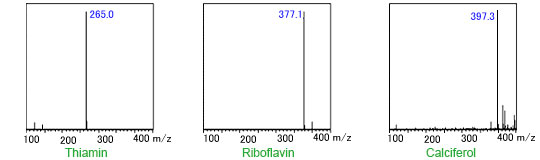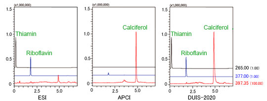 下面是一個使用雙離子源分析的例子。對于核黃素(riboflavin),ESI可以獲得的很好的加質子峰,而APCI則相應較弱;對于硫胺素(thiamin),ESI可以獲得的很好的響應,而APCI則沒有信號。相反,對于鈣化醇(calciferol),APCI可以獲得很好的加質子峰而ESI不能離子化。當使用DUIS-2020檢測時,這三種都具有良好的靈敏度。除了離子化范圍方面有明顯的優勢,DUIS-2020還可獲得高質量的質譜圖,如下所示。