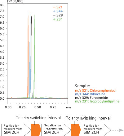 為了同時檢測正離子和負離子,檢測需要在正負離子模式間交替切換。LCMS -2020,通過高壓電源技術實現了速度很高的極性切換。