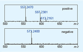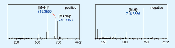 雜質a的m/z 718的MS/MS譜圖結果如圖5所示。將本譜圖與主成分阿托伐他汀的MS/MS譜圖進行比較,推測雜質a的結構為圖6。并且,對于更微量的雜質b(約0.01%,參照圖1),如圖7所示,能夠以出色的S/N比獲得正、負極性的質譜圖。