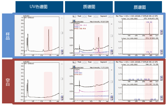 利用作為LabSolutions附屬功能的數據瀏覽器,比較樣品與空白的數據,可方便地確認雜質的質譜圖。