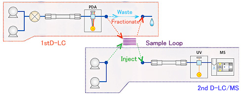 在此系統(tǒng)的1維中,以通常的HPLC分析條件進行分離,將需要進行結構解析的雜質峰的峰頂附近導入捕集環(huán)路。此環(huán)路對于2維的分離起到進樣器的作用。2維起到分離1維的流動相成分和目的雜質,以及導入至LC/MS的作用。