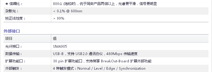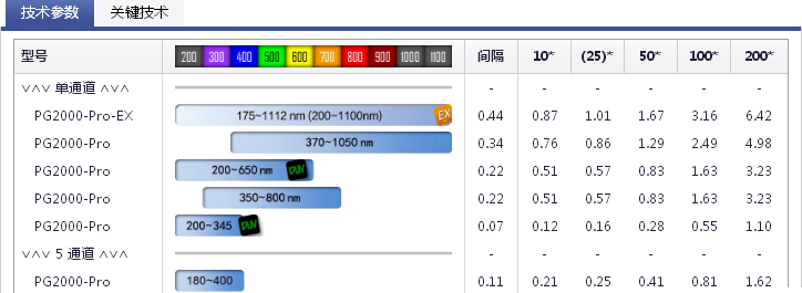 1 峰值 70% 的紫外響應(yīng) PG2000-Pro 采用日本濱松 薄型背照式 CCD,在紫外 200nm 處擁有超過 70% 的量子化效率,非常適合于包含紫外波段的寬光譜測量; 2 64x2048 超大感應(yīng)面 PG2000-Pro 采用 64 行像素超大感應(yīng)面積的 CCD,相較普通的 14 行像素 CCD,靈敏度進一步提升 4 倍;