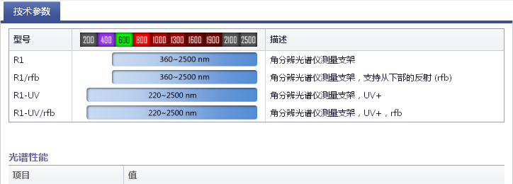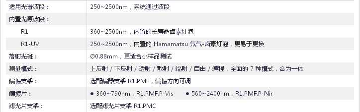 2 最寬 250~2500nm 譜段 R1 角分辨光譜儀內置氘氣 / 鹵素光源,結合Polka 分束鏡,并選取消除色差的 Fluorite 螢石晶體透鏡,提供 250~2500nm 超寬波段光譜測量;